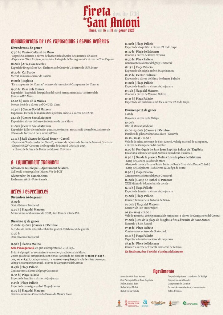 Fireta de St. Antoni 2026 (Muro), dies 16, 17, 18 (gener). 42 Aplec de Danses el 18/01/2026.